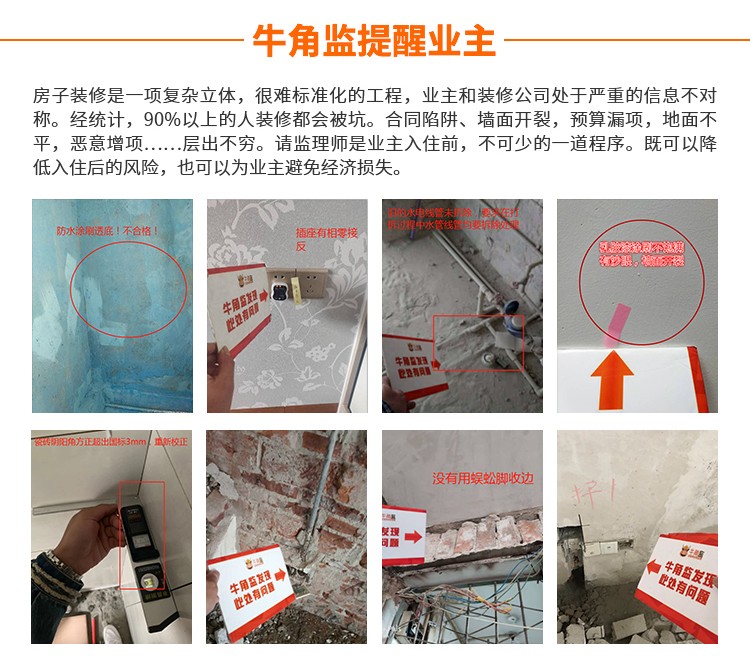 80平方起算,牛角监提供10个装修节点上门监理验收的服务,服务内容涵盖开工交底、水电阶段、泥木阶段、油漆阶段、安装阶段、竣工阶段等重点施工阶段。