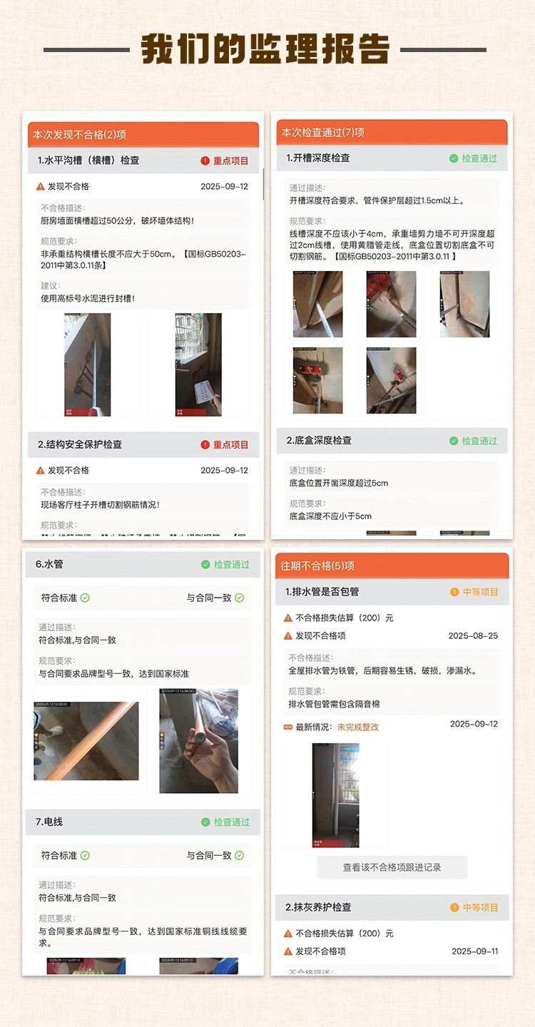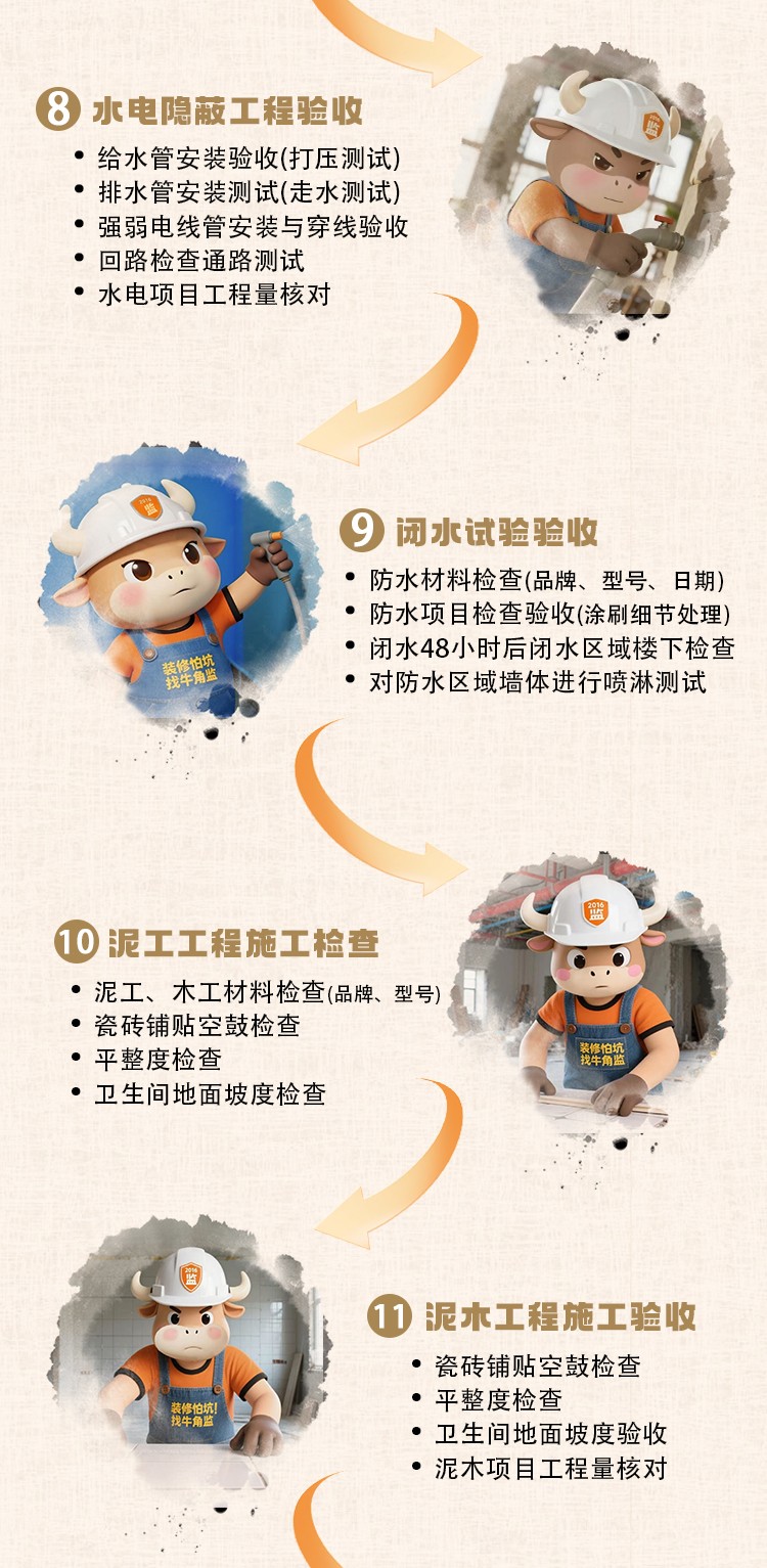 80平方起算,牛角监提供10个装修节点上门监理验收的服务,服务内容涵盖开工交底、水电阶段、泥木阶段、油漆阶段、安装阶段、竣工阶段等重点施工阶段。