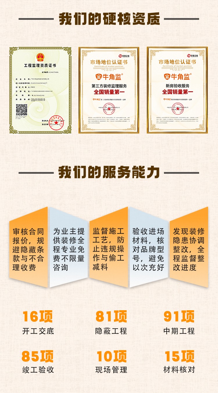 牛角监成立于2016年,以“让天下装修没烦恼”为公司使命,“只做监理不推销”是公司核心原则。牛角监拥有国家级的监理资质,监理服务覆盖了数十城市,已经成为广受行业、消费者的认可和尊重的领头牛企业。